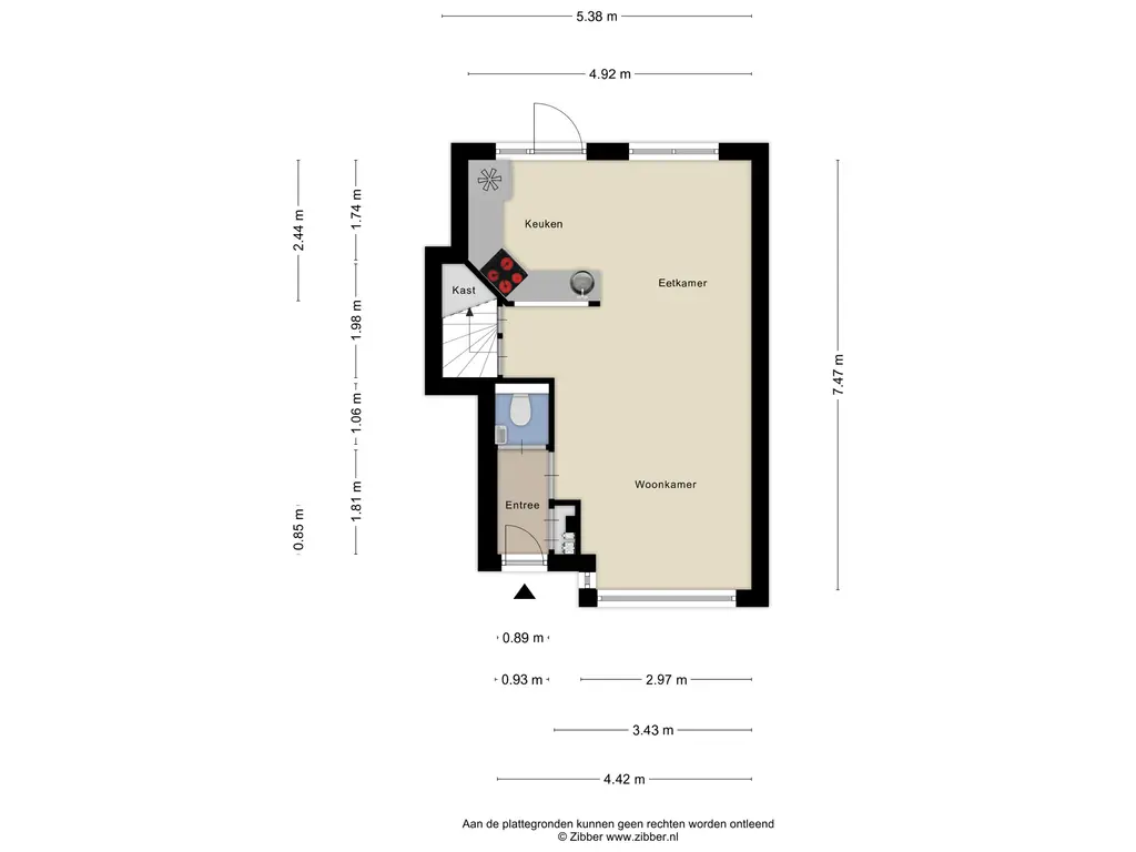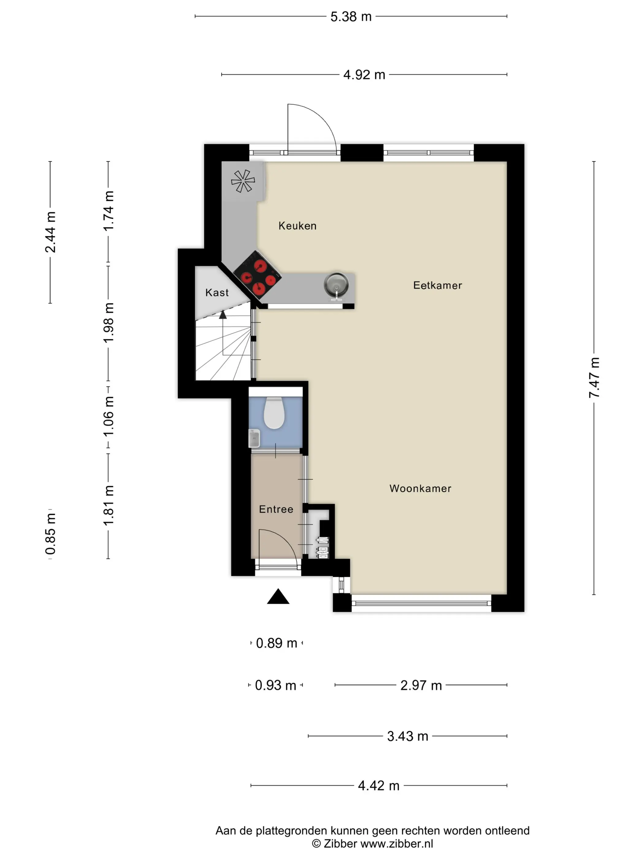 Via de verzorgde voortuin bereikt u de entree van de woning. De hal geeft toegang tot het toilet en de lichte woonkamer. Aan de achterzijde bevindt zich een gezellige eethoek met open verbinding naar de functionele hoekkeuken, voorzien van gaskookplaat, spoelbak en voldoende kastruimte. Een trapkast zorgt voor extra bergruimte. Vanuit de keuken loopt u zo de achtertuin in.