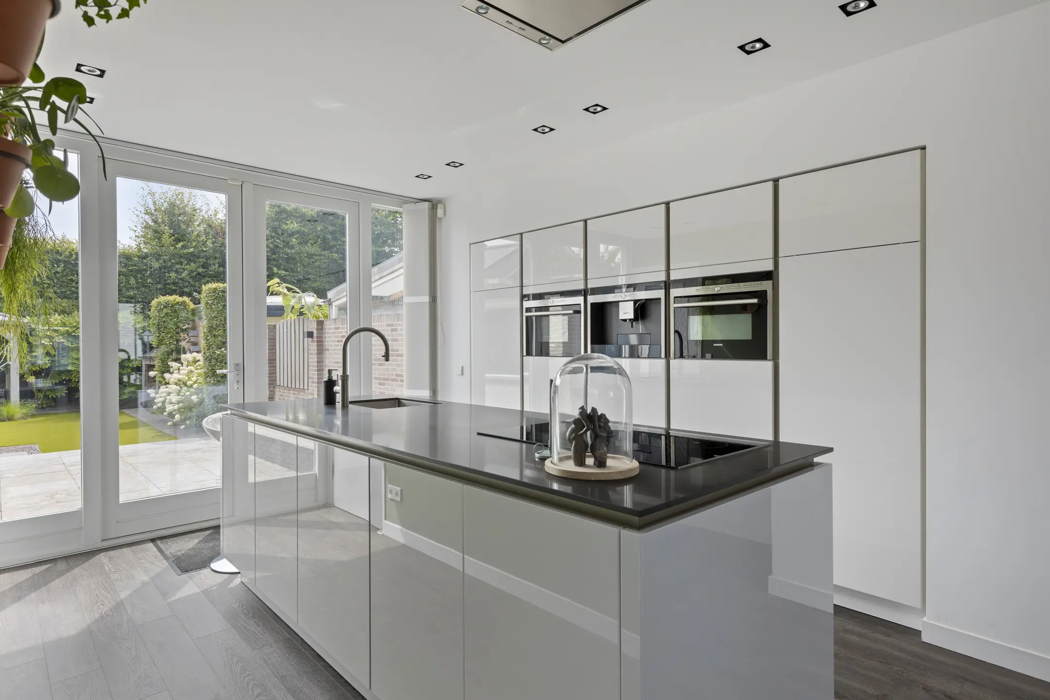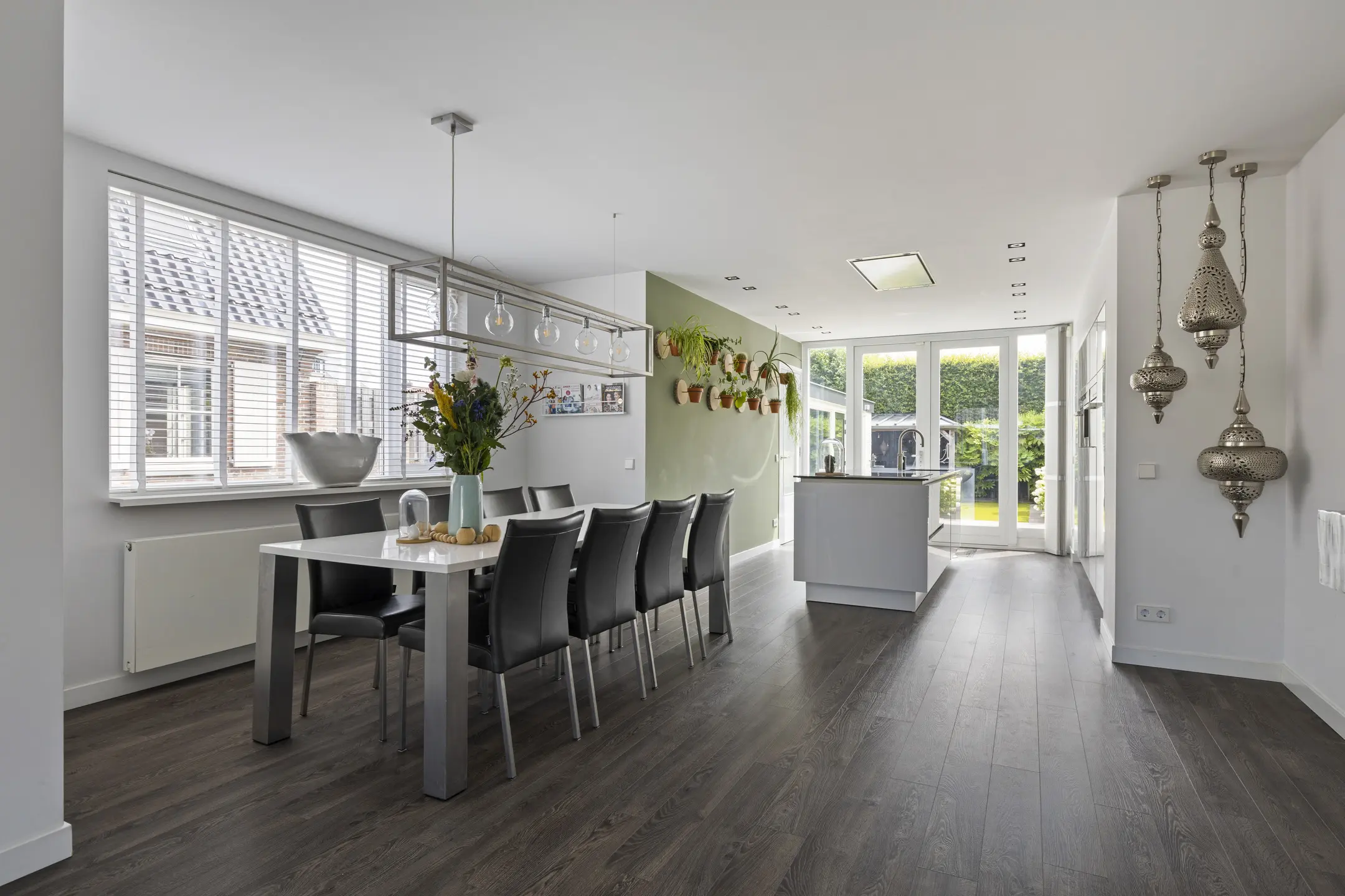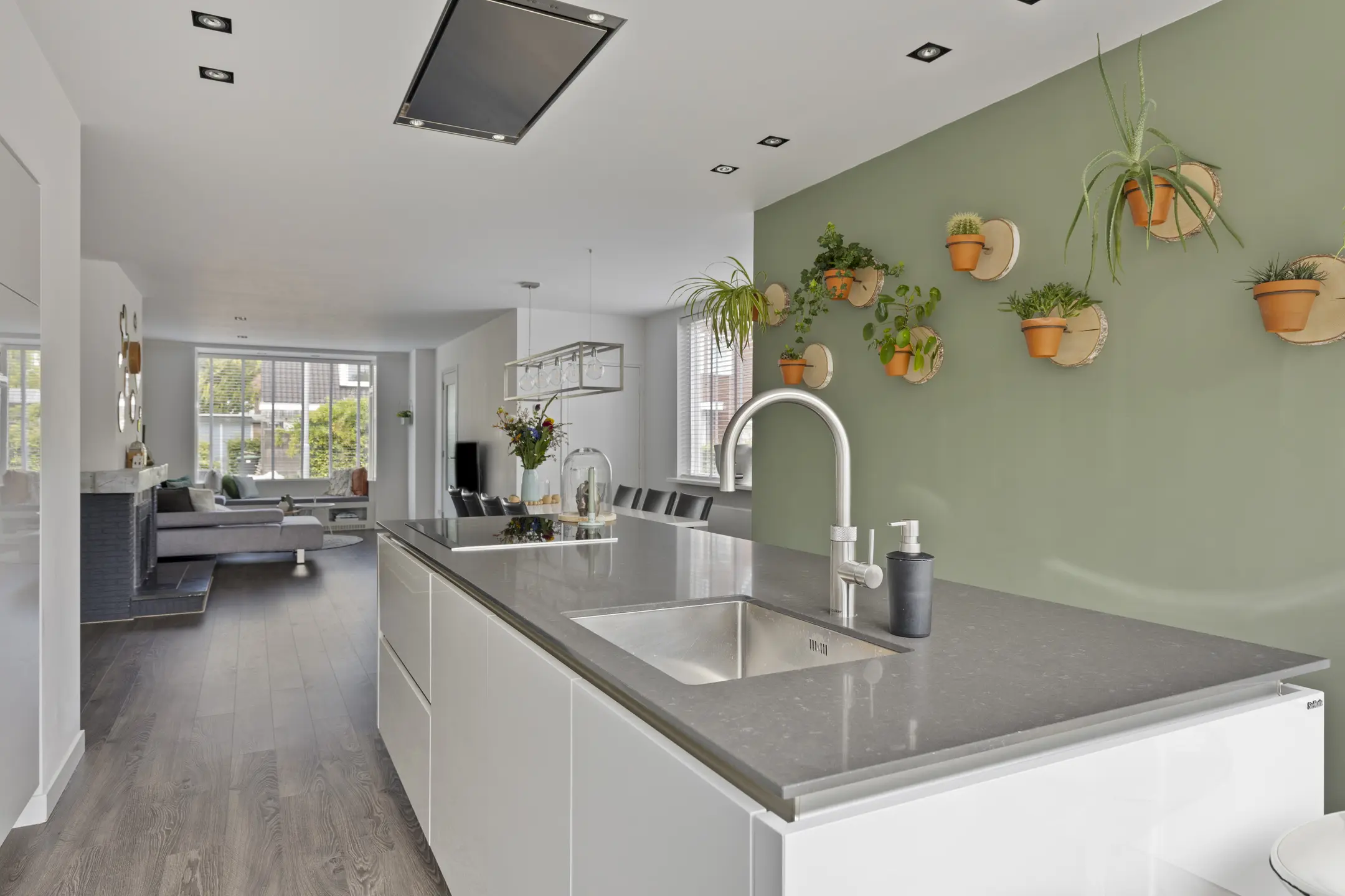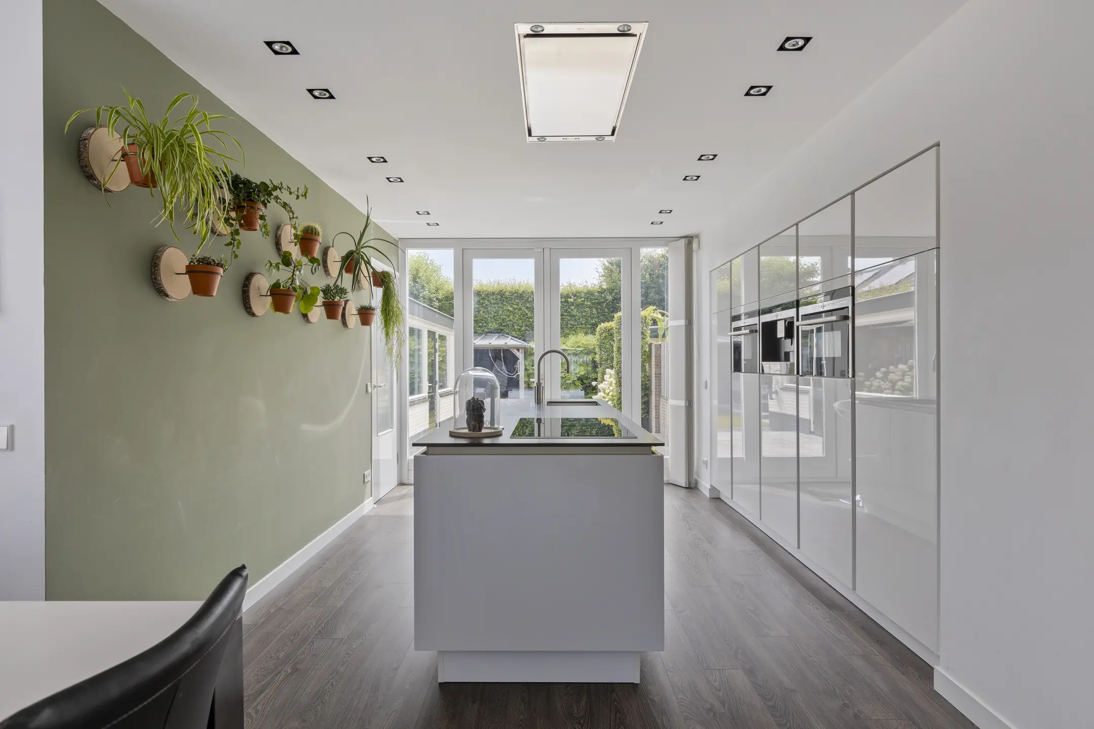 Binnen stap je in een sfeervolle en lichte woning. De open keuken met aanbouw vormt het hart van het huis – een plek waar gezellig samen koken en tafelen centraal staan. Dankzij de slimme indeling en royale lichtinval voelt de woning direct warm en uitnodigend aan.