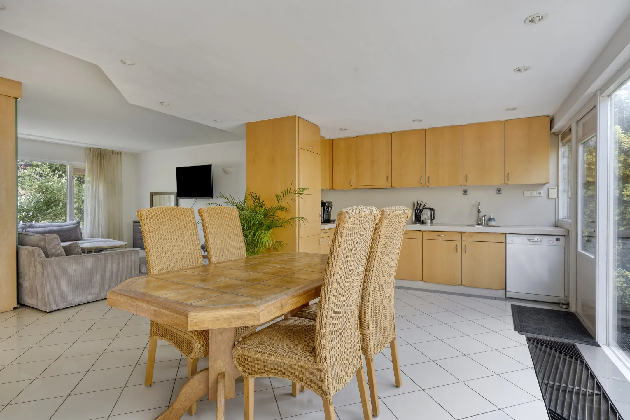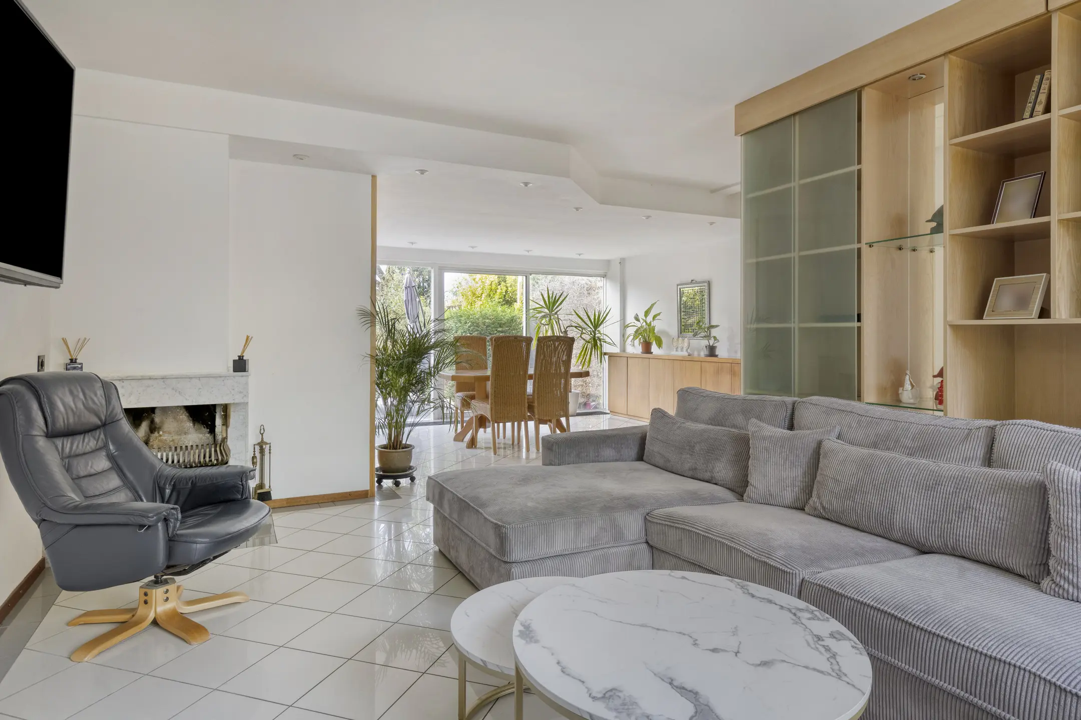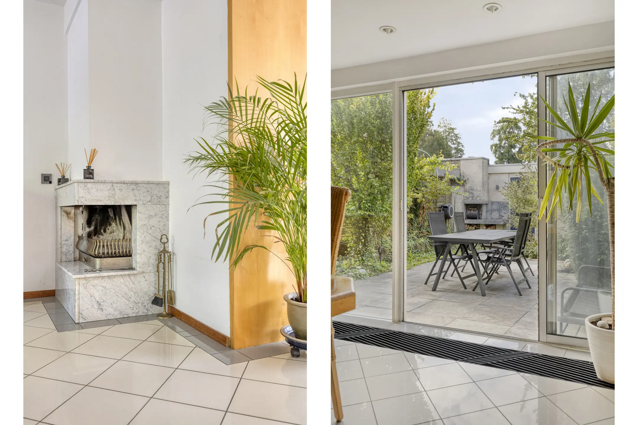 Begane grond: entree met hal, meterkast en toilet. De ruime Z-vormige woonkamer is heerlijk licht dankzij de grote schuifpui naar de tuin. De combinatie van een lichte plavuizen vloer, vloerverwarming en een sfeervolle open haard maakt dit een zeer prettige leefruimte. De open keuken in L-opstelling is voorzien van diverse inbouwapparatuur.