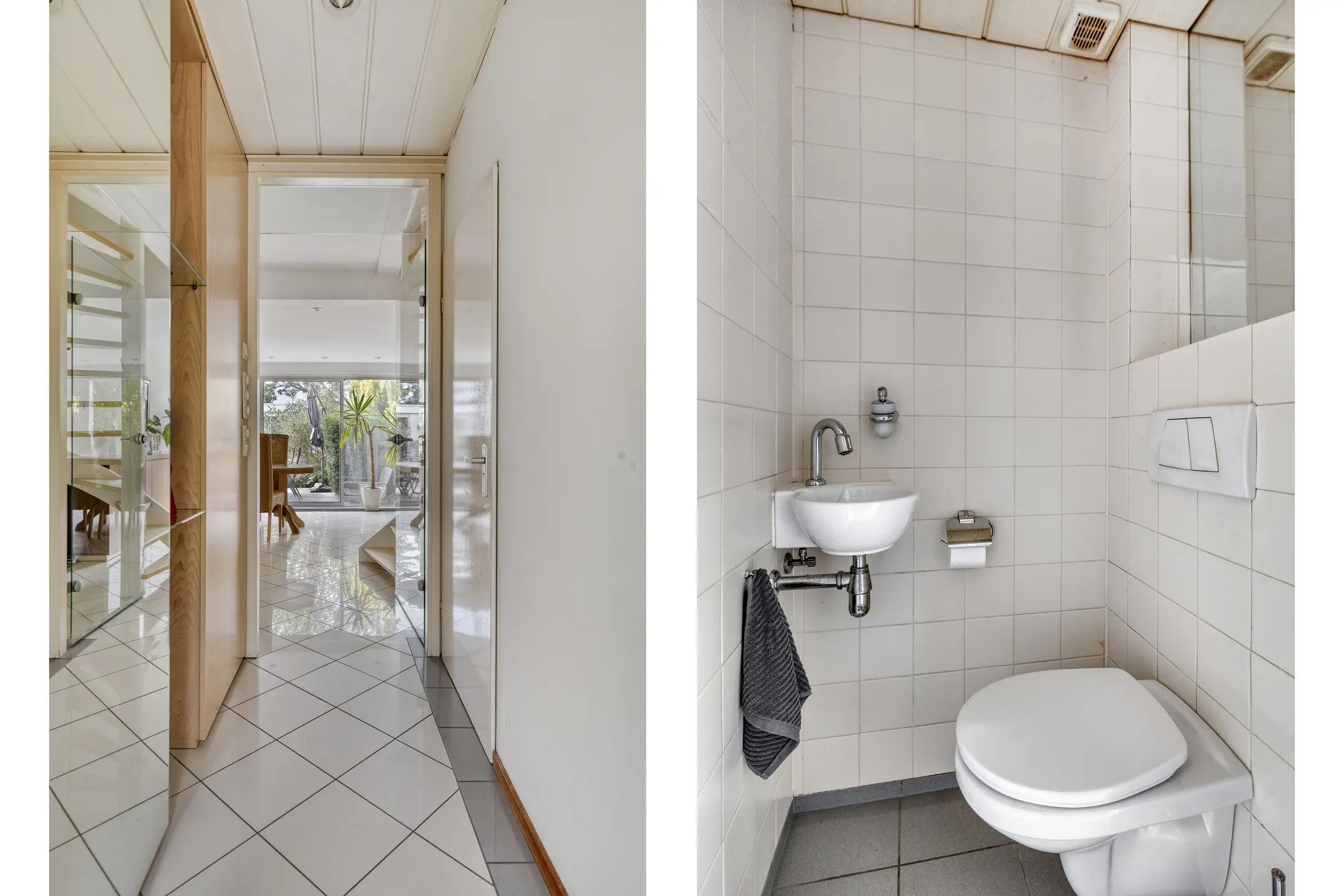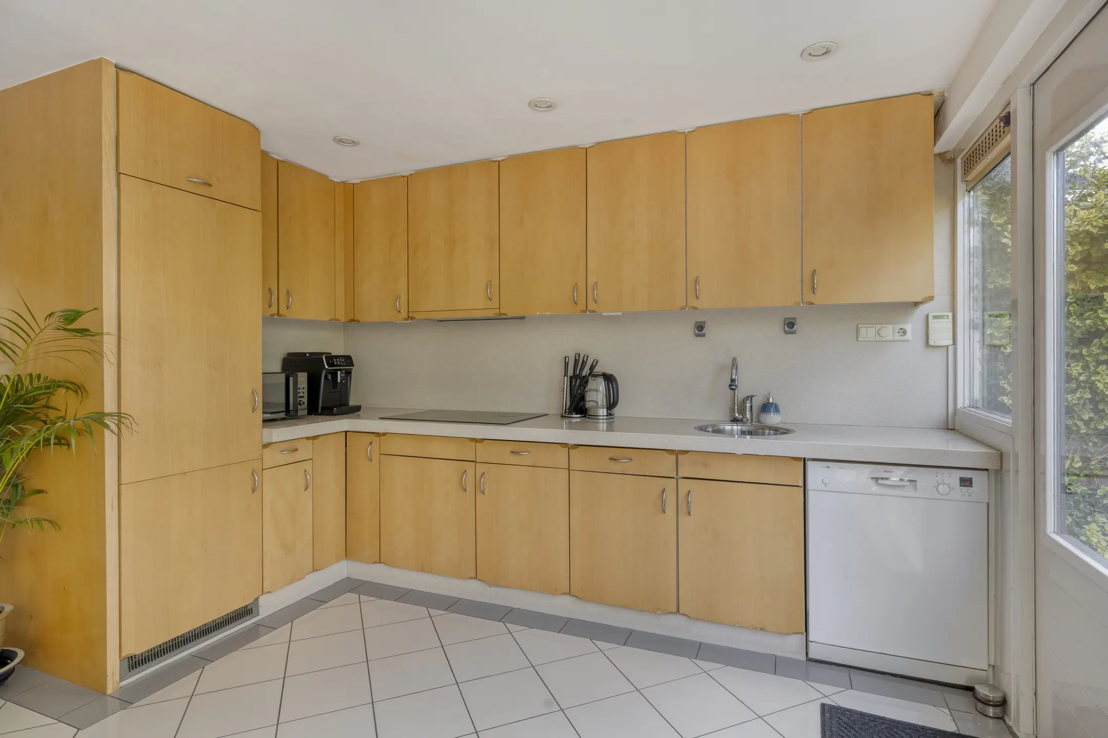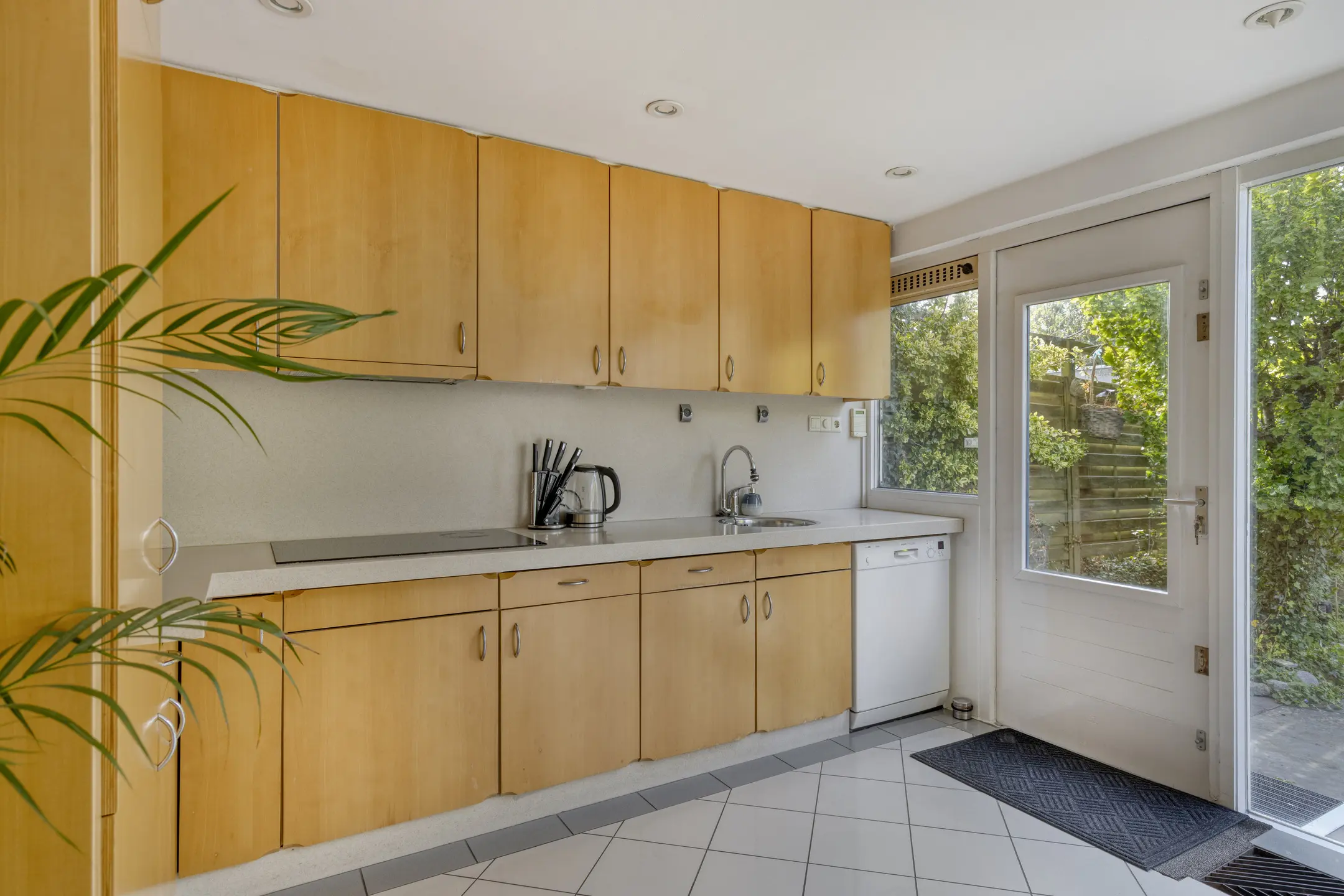 Begane grond: entree met hal, meterkast en toilet. De ruime Z-vormige woonkamer is heerlijk licht dankzij de grote schuifpui naar de tuin. De combinatie van een lichte plavuizen vloer, vloerverwarming en een sfeervolle open haard maakt dit een zeer prettige leefruimte. De open keuken in L-opstelling is voorzien van diverse inbouwapparatuur.