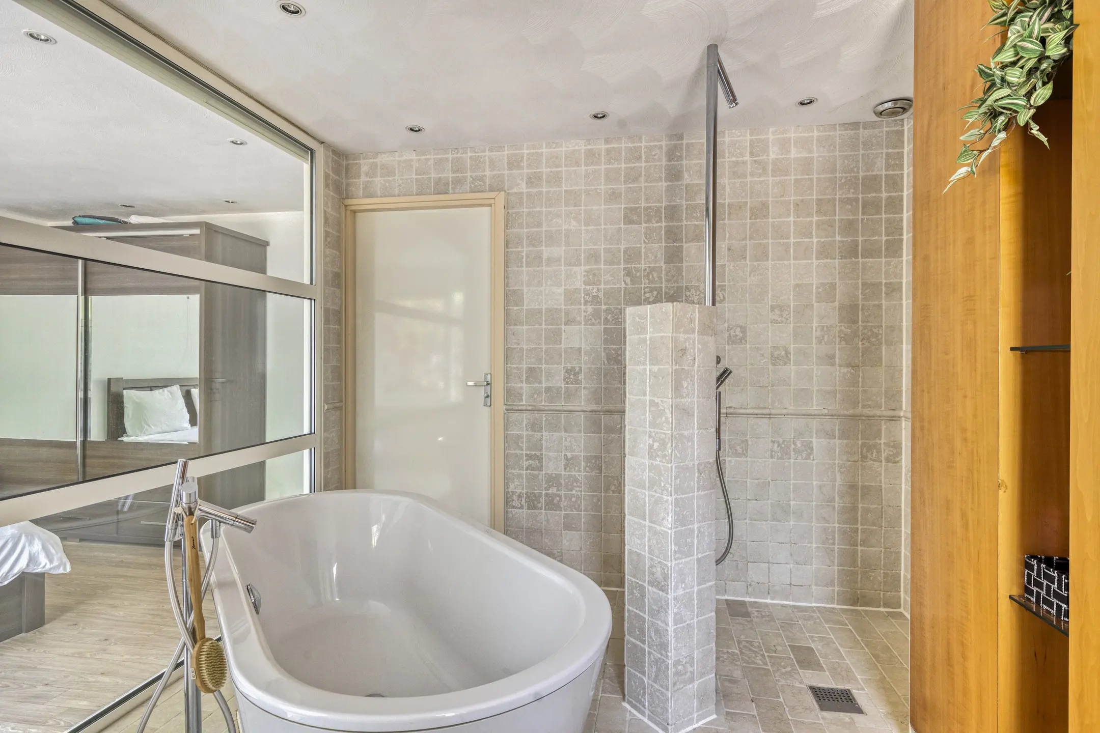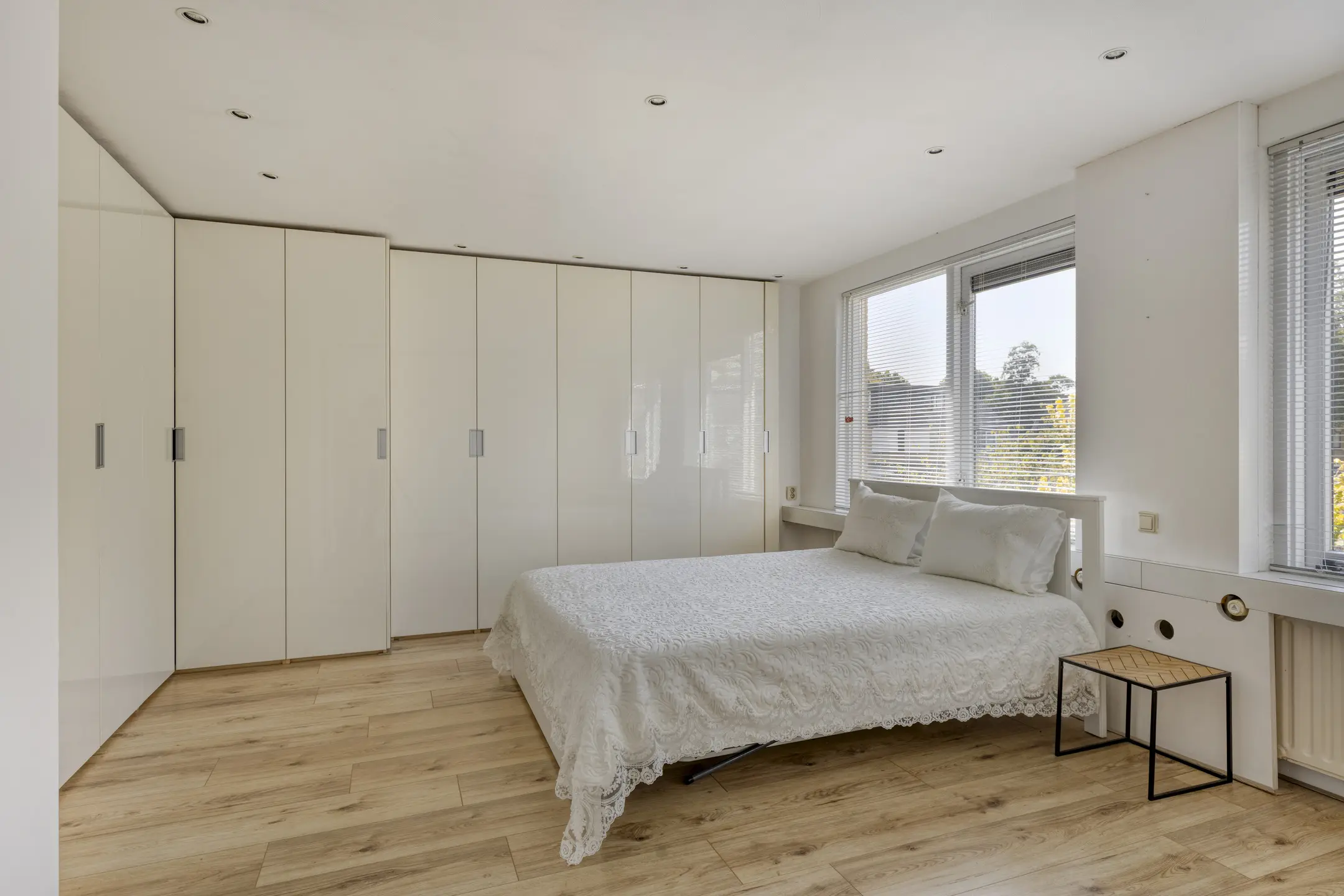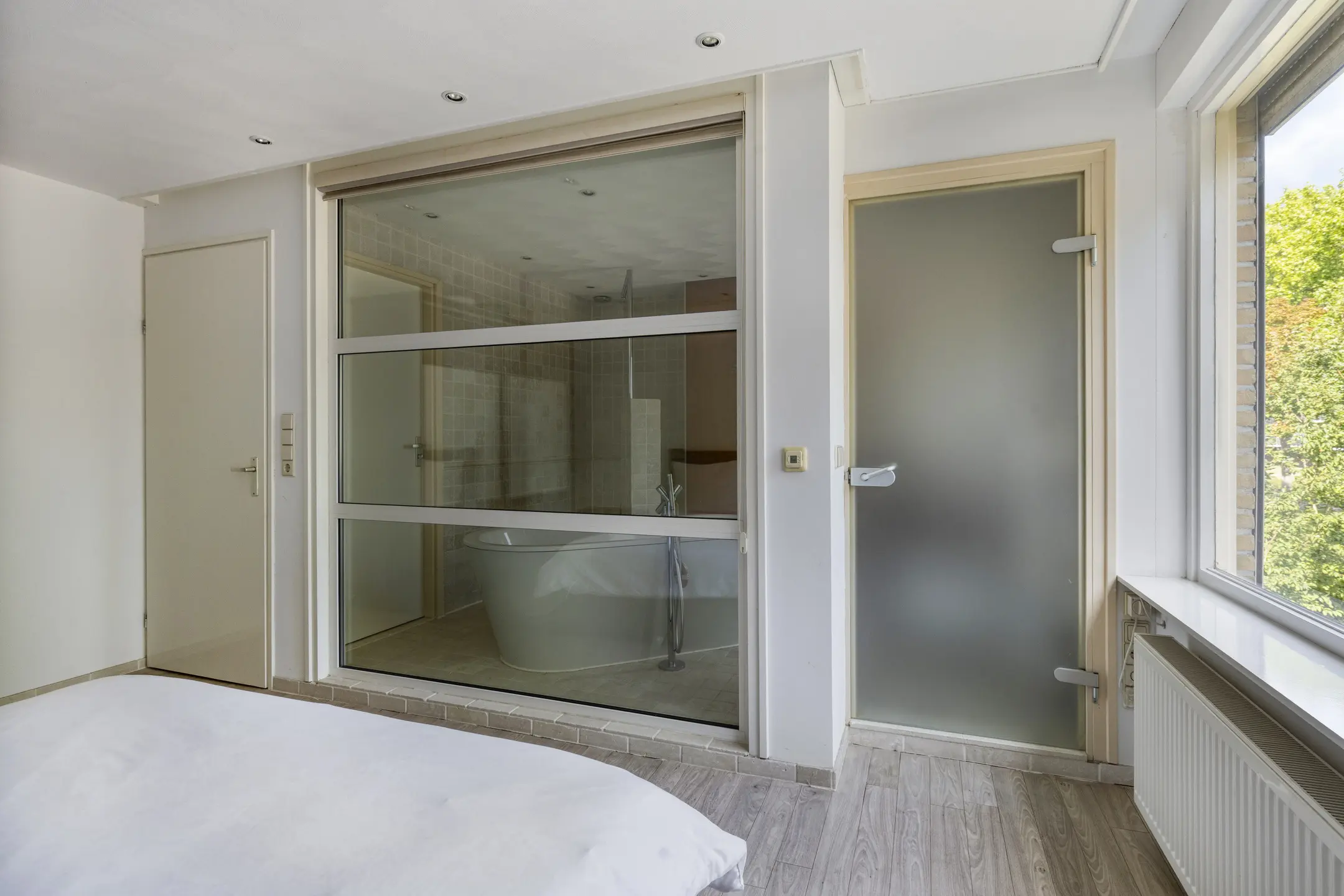 Eerste verdieping: hier vind je een royale slaapkamer aan de achterzijde (voorheen twee kamers), een ruime ouderslaapkamer aan de voorzijde én een luxe badkamer. De badkamer is stijlvol ingericht met sanitair van Philippe Starck (Duravit) en beschikt over een losstaand ligbad, een inloopdouche, een wastafel en toilet. De strak gestuukte wanden en plafonds met inbouwspots maken het geheel helemaal af.