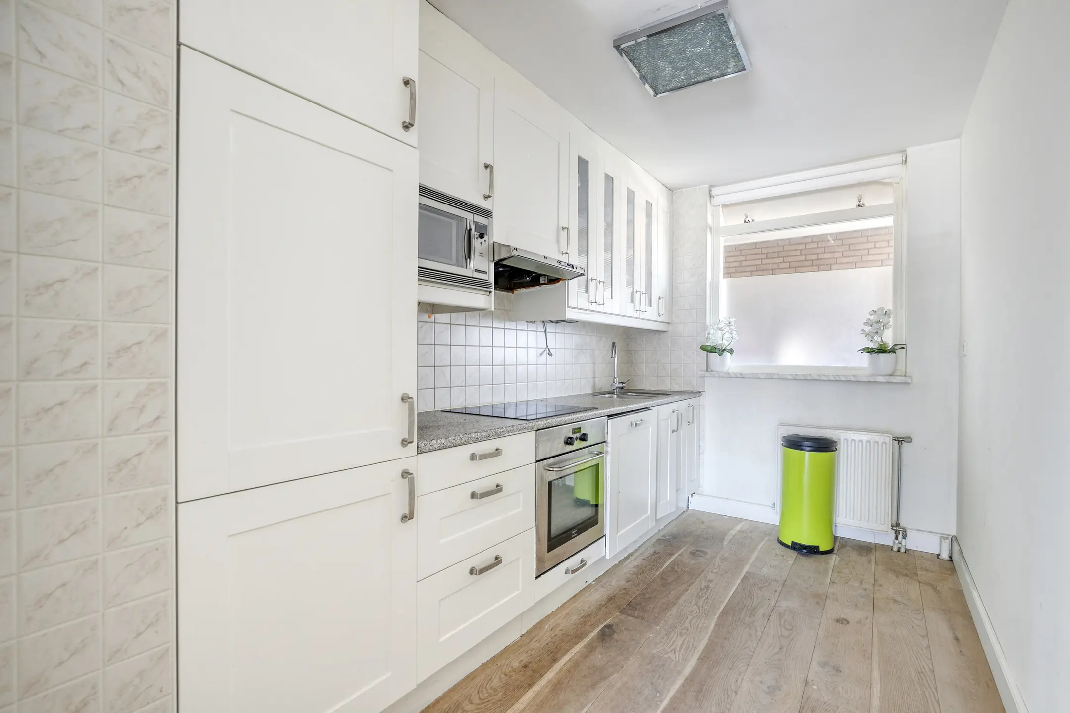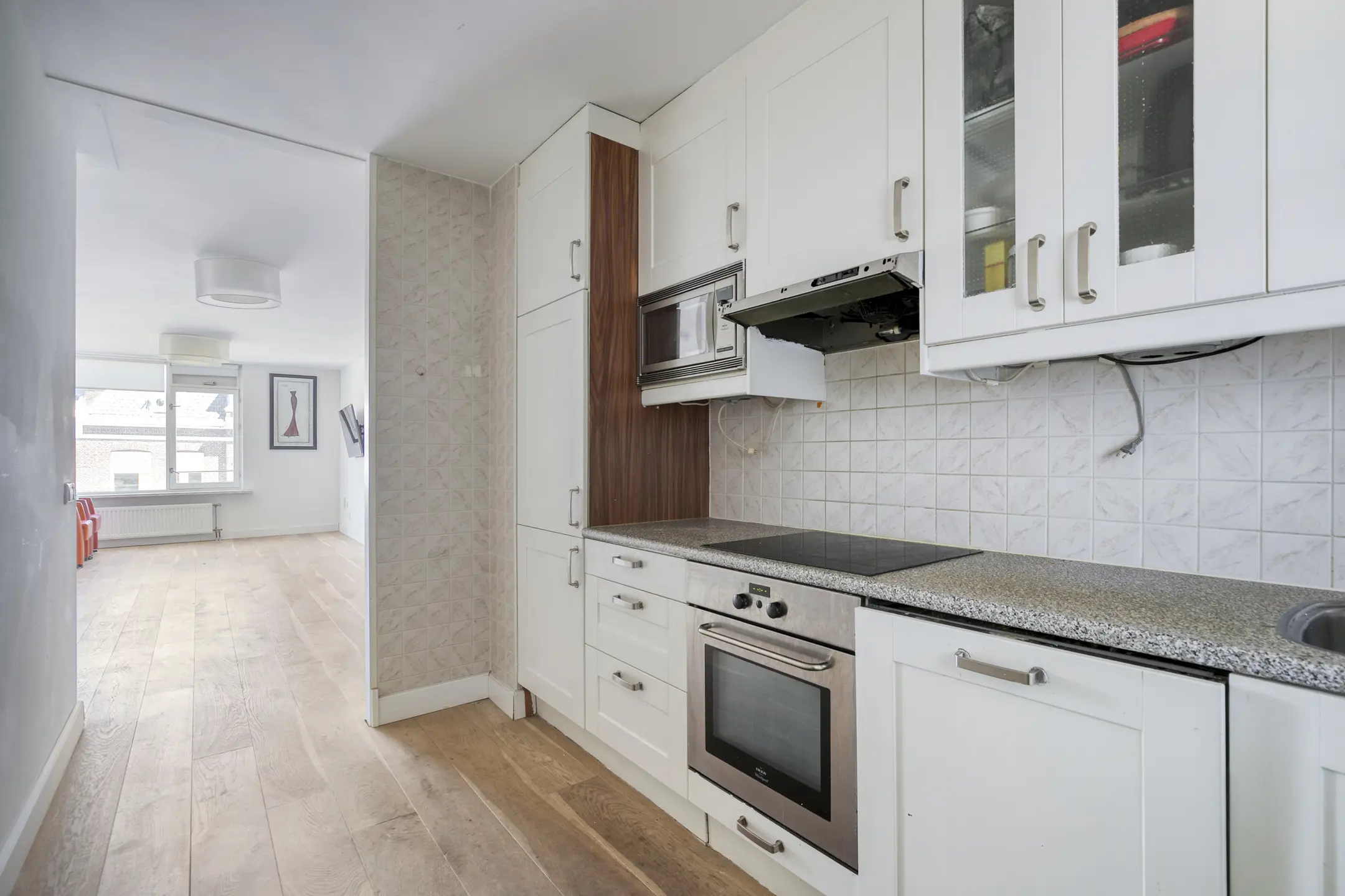 De moderne, open keuken is een echte blikvanger en volledig uitgerust met hoogwaardige inbouwapparatuur, hier bereid je met plezier iedere maaltijd. Dankzij de grote ramen baadt het appartement in natuurlijk licht en voel je je hier direct thuis.