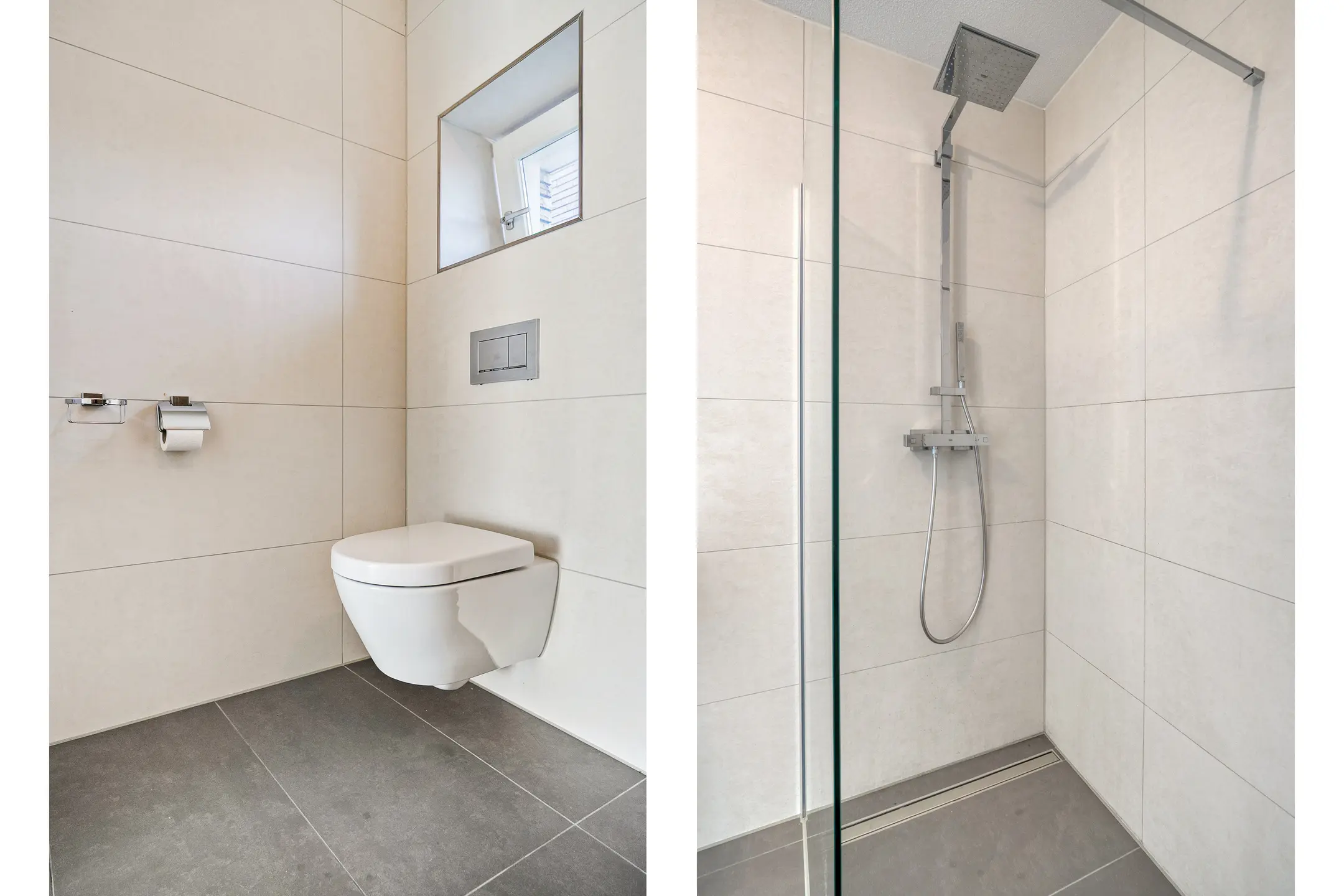 This floor includes three spacious bedrooms, all with large windows that bring in plenty of natural light. The modern bathroom is fitted with a walk-in shower, second toilet, and a stylish washbasin unit.