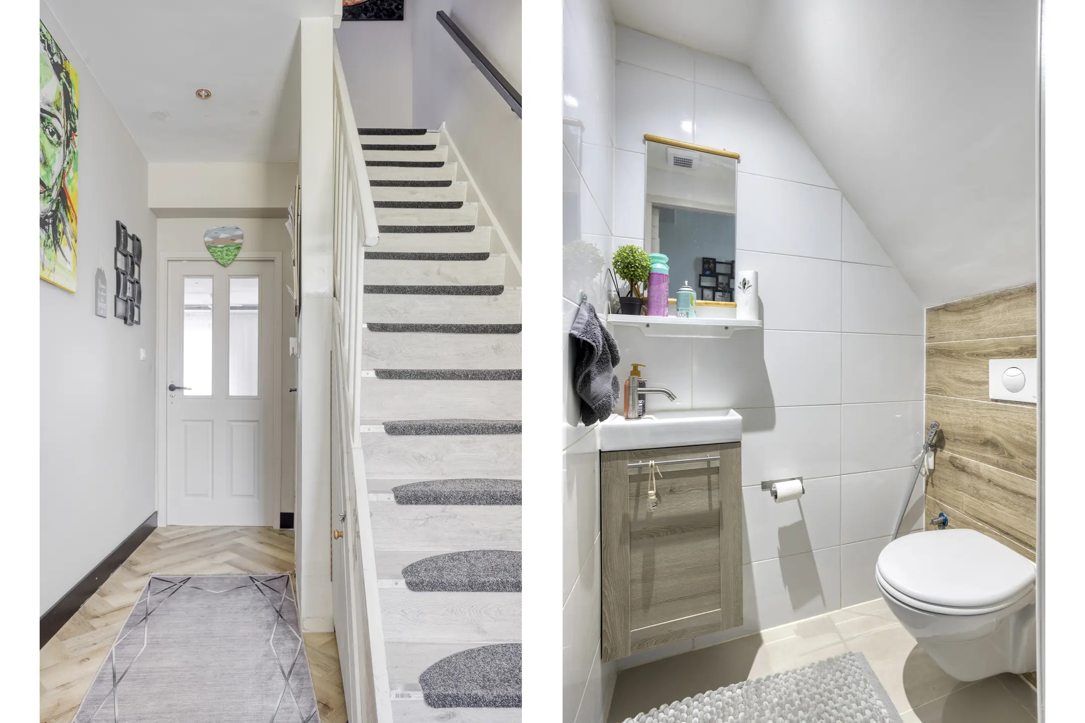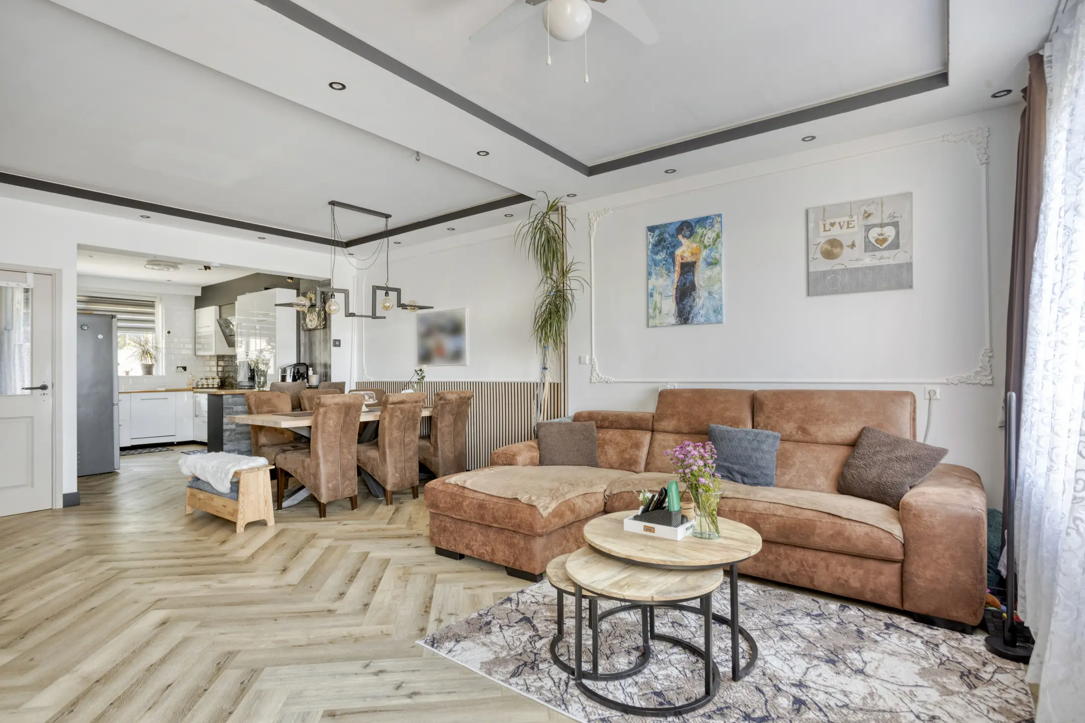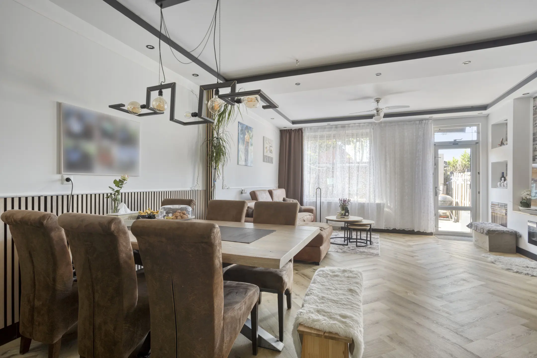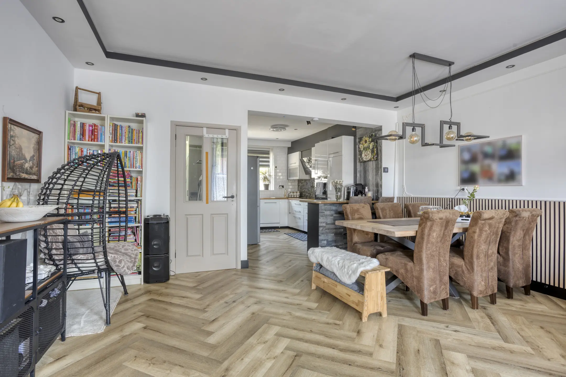 Entree met hal, modern toilet en trapopgang. De ruime, lichte woonkamer is voorzien van een prachtige visgraatvloer en staat in open verbinding met de moderne keuken met inbouwapparatuur en strak werkblad. Openslaande deuren geven toegang tot de fraai aangelegde tuin op het westen, inclusief een overkapping – perfect voor lange zomeravonden of beschut buiten zitten in elk seizoen. De achterzijde van de woning is uitgebouwd, wat zorgt voor extra leefruimte en een prettige lichtinval.
