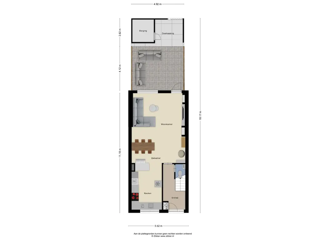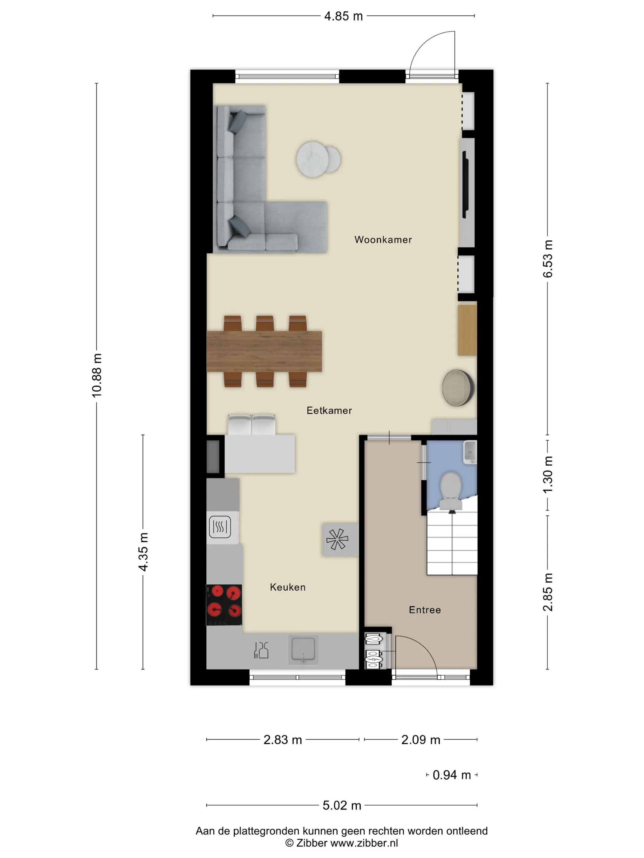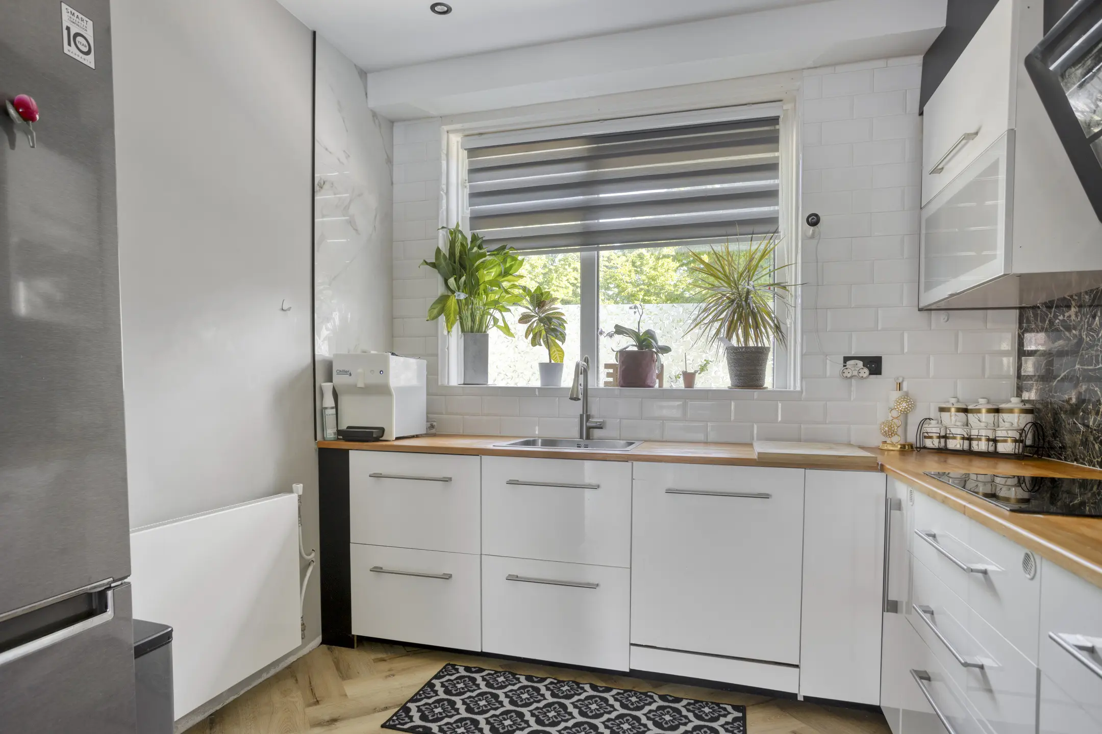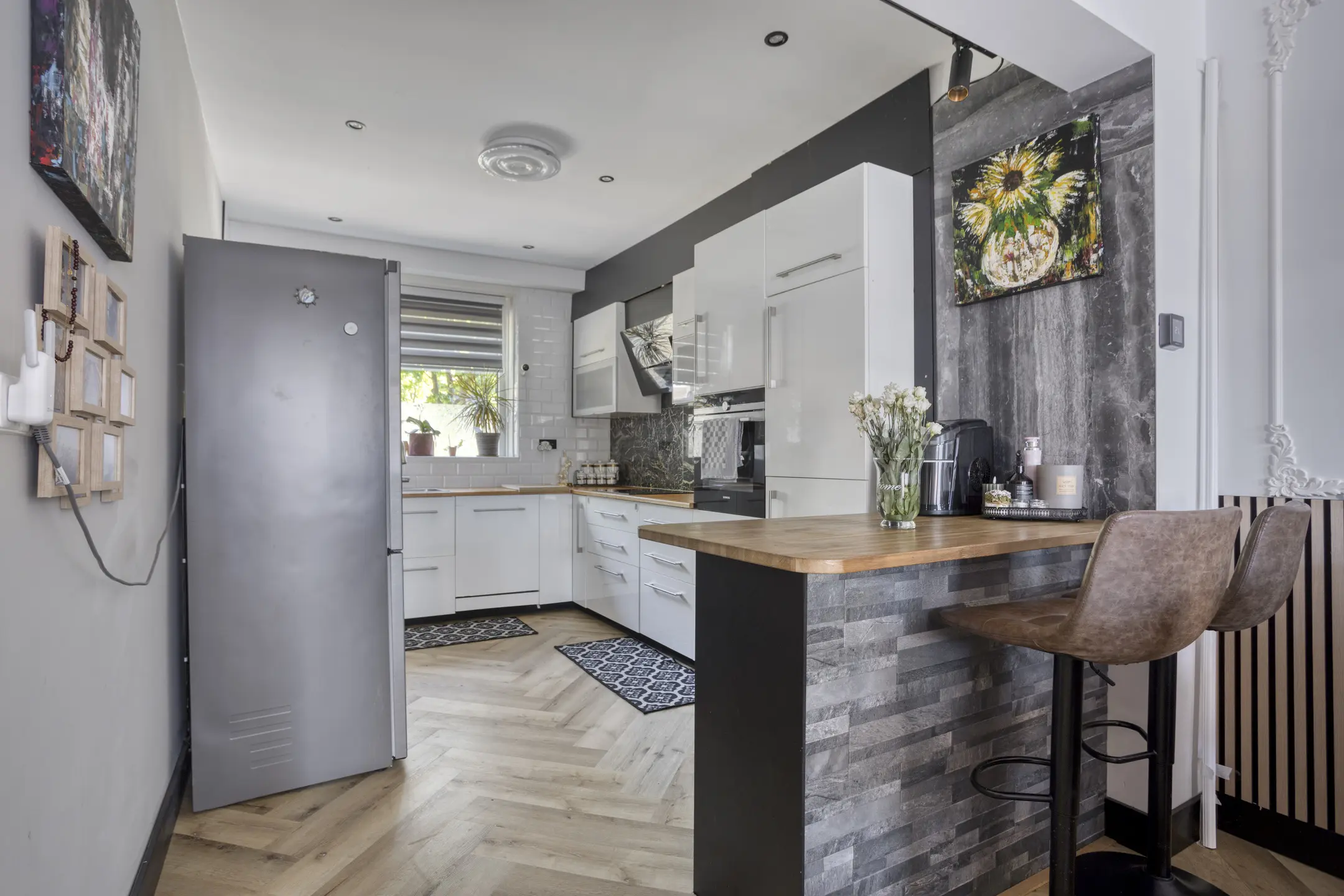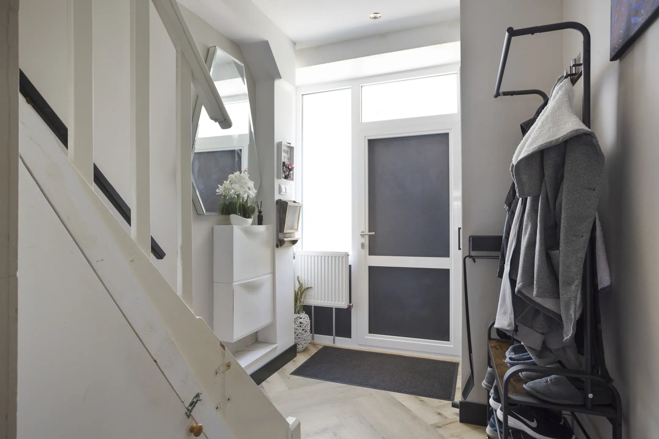 Entree met hal, modern toilet en trapopgang. De ruime, lichte woonkamer is voorzien van een prachtige visgraatvloer en staat in open verbinding met de moderne keuken met inbouwapparatuur en strak werkblad. Openslaande deuren geven toegang tot de fraai aangelegde tuin op het westen, inclusief een overkapping – perfect voor lange zomeravonden of beschut buiten zitten in elk seizoen. De achterzijde van de woning is uitgebouwd, wat zorgt voor extra leefruimte en een prettige lichtinval.