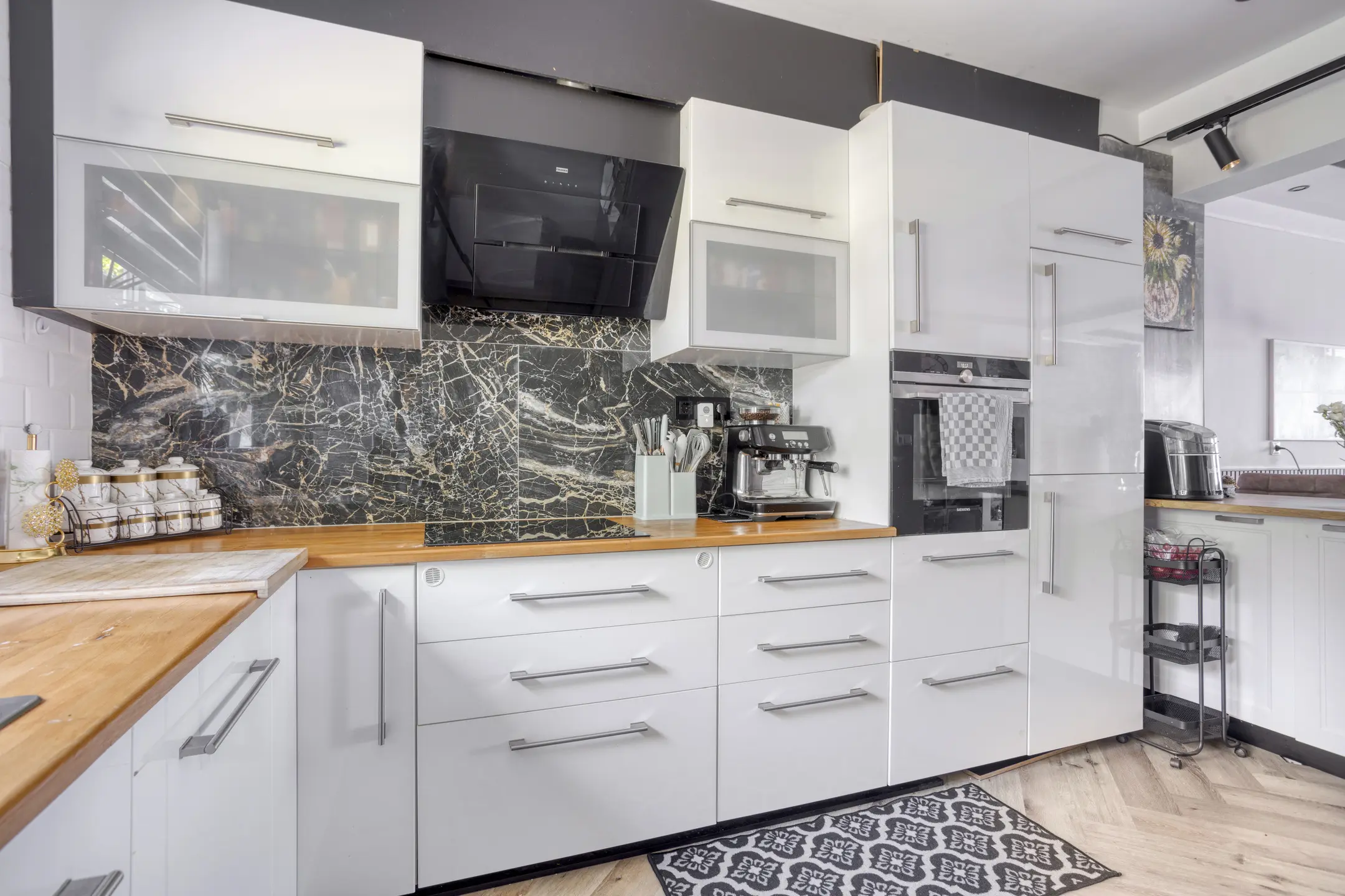 Entrance with hallway, modern toilet, and staircase. The spacious, bright living room features stunning herringbone flooring and seamlessly connects to the modern kitchen with built-in appliances and sleek countertops. French doors open onto the beautifully landscaped west-facing garden with a covered patio – perfect for long summer evenings or enjoying the outdoors in any season.