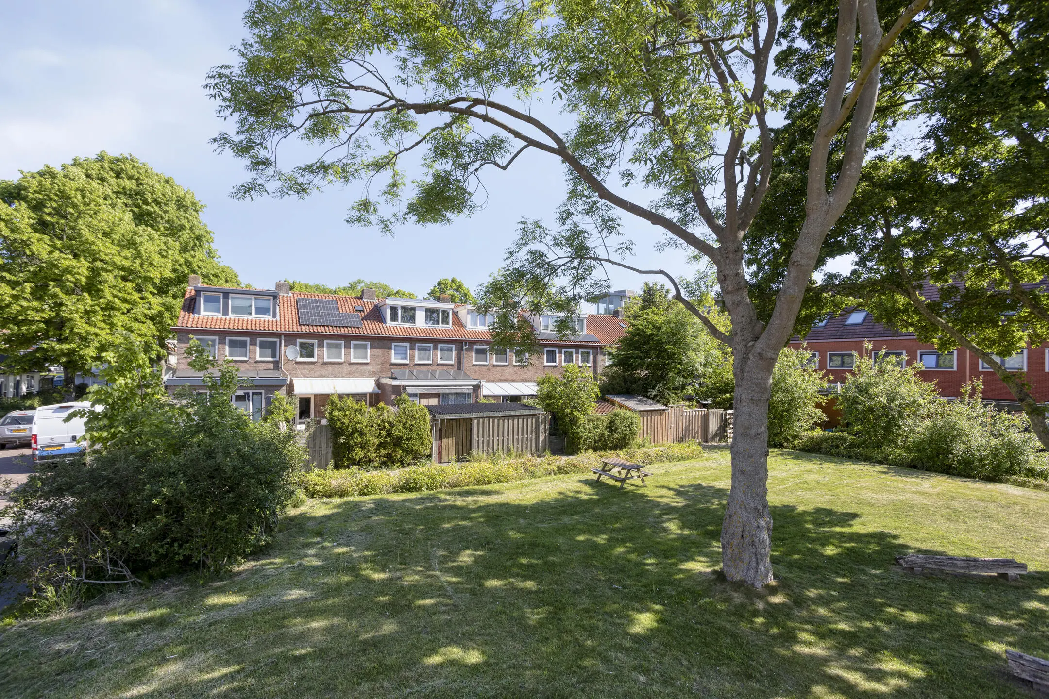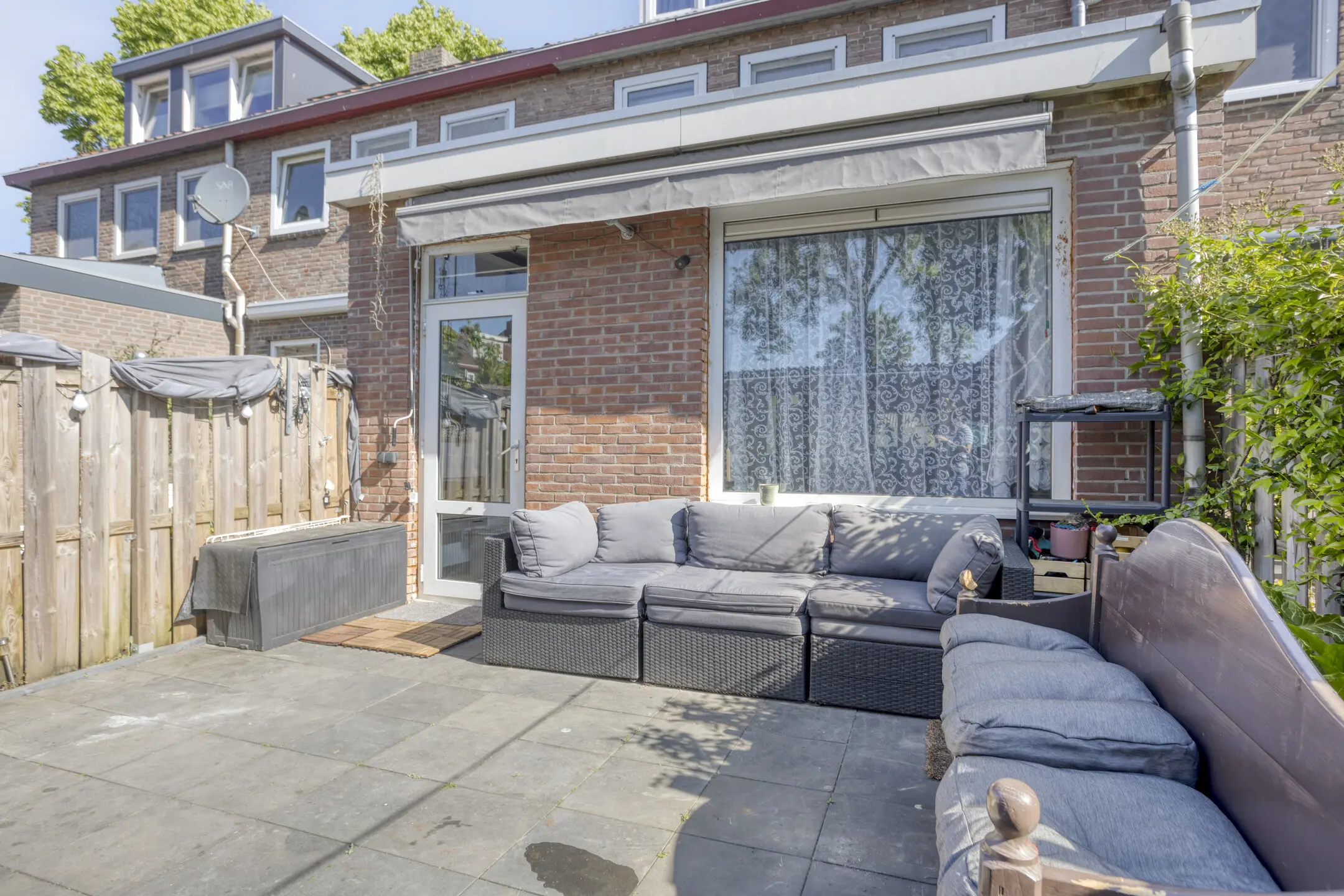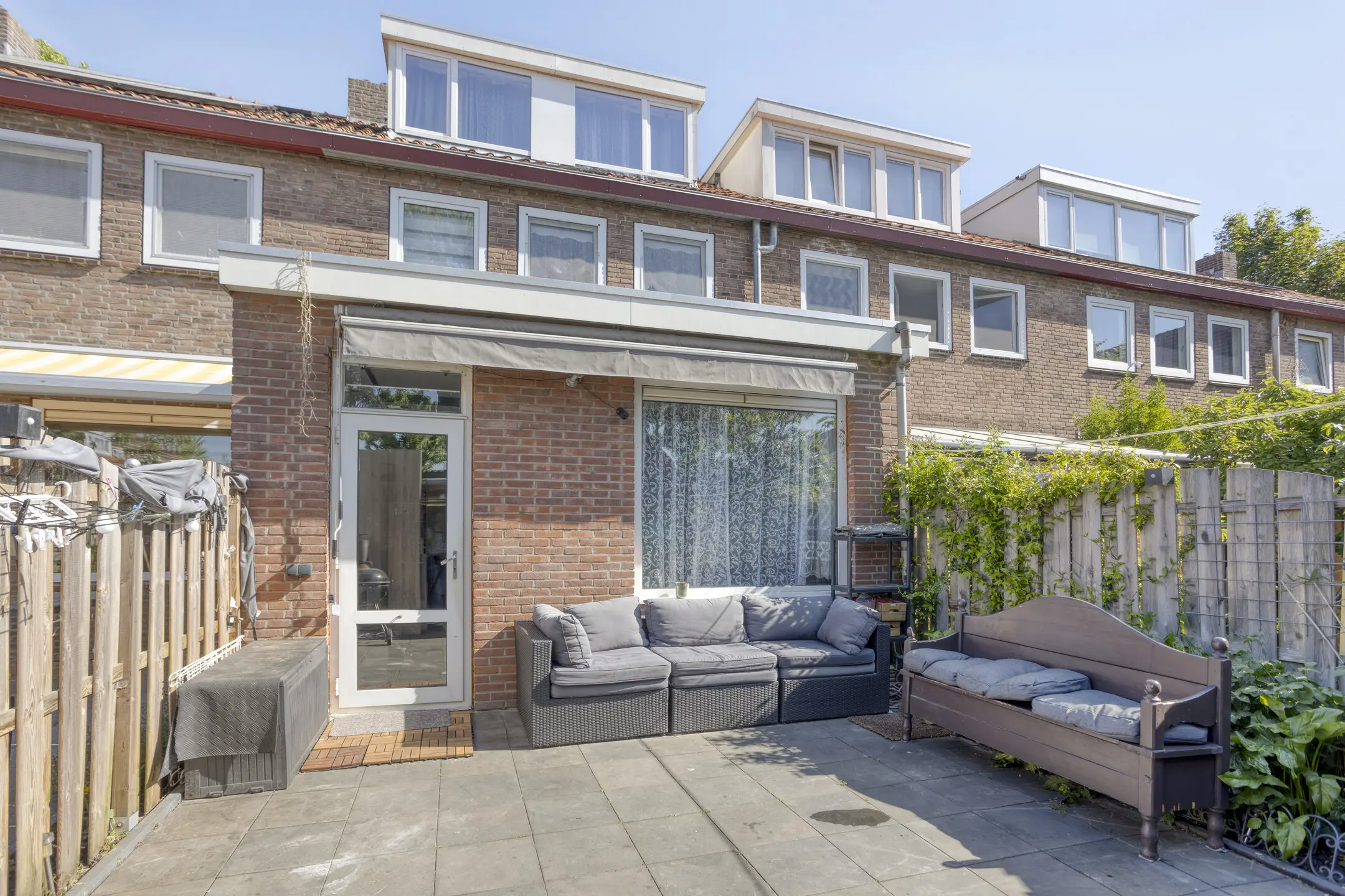 Located in a quiet, green neighborhood in Amsterdam, this beautifully maintained terraced house offers no less than four full-sized bedrooms, two bathrooms, a modern open kitchen with herringbone flooring, and a sunny west-facing garden with a covered patio.