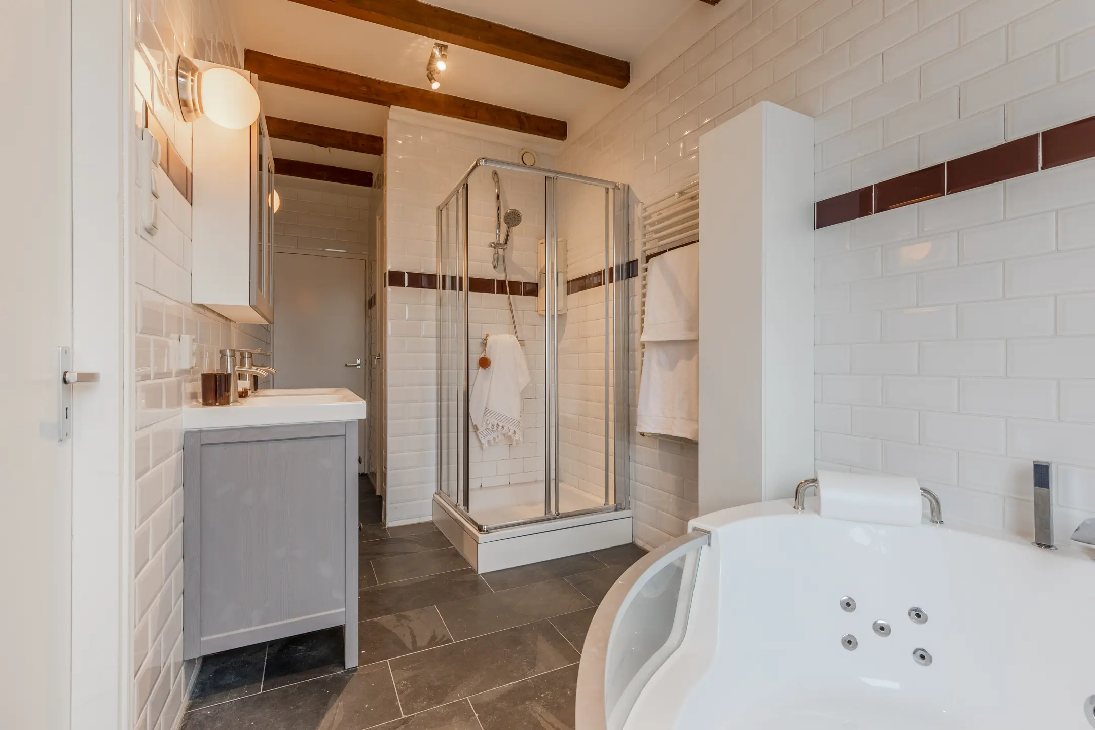 - Spacious bathroom: with a walk-in shower and sink and a bathtub—ideal for families