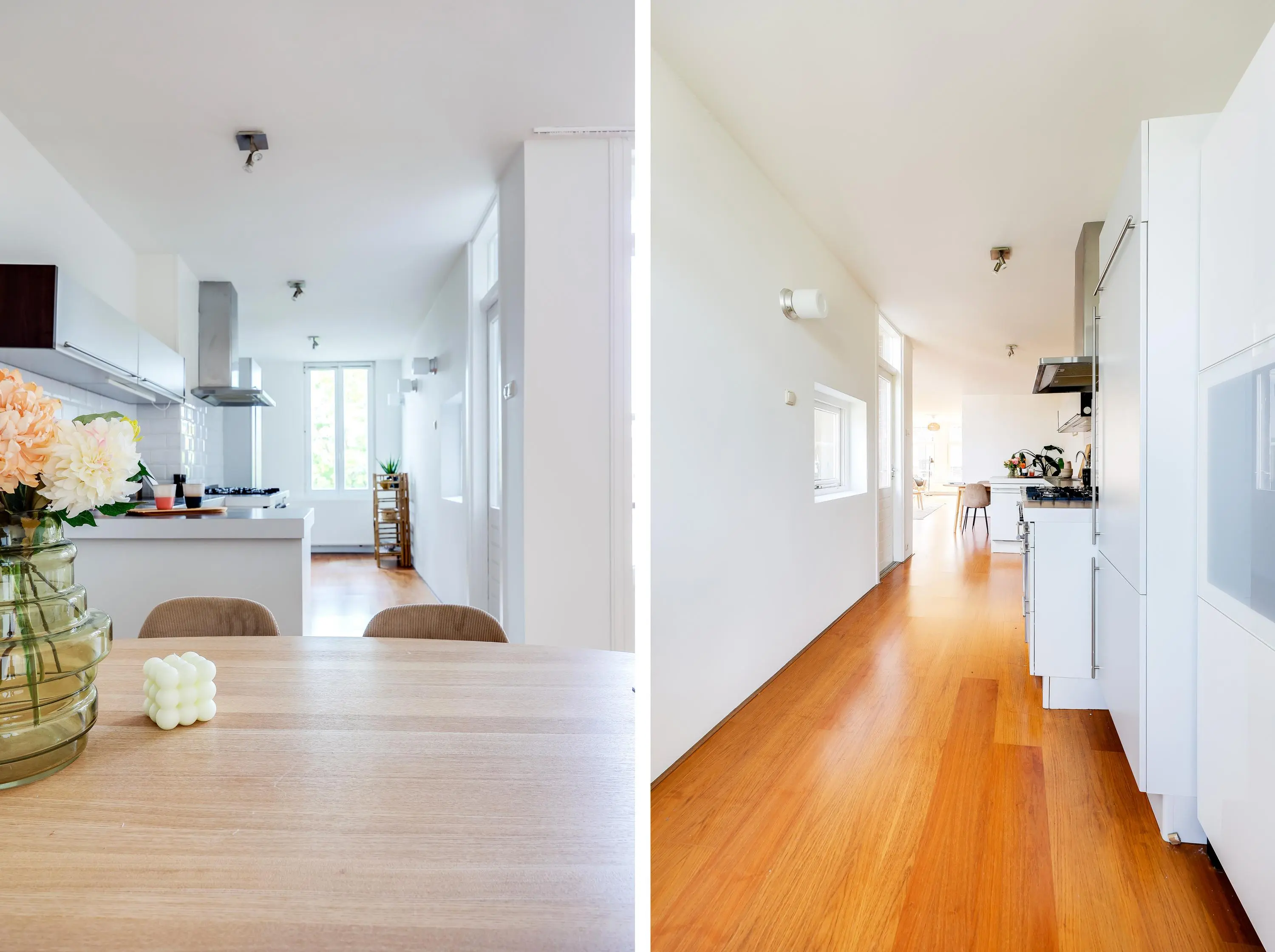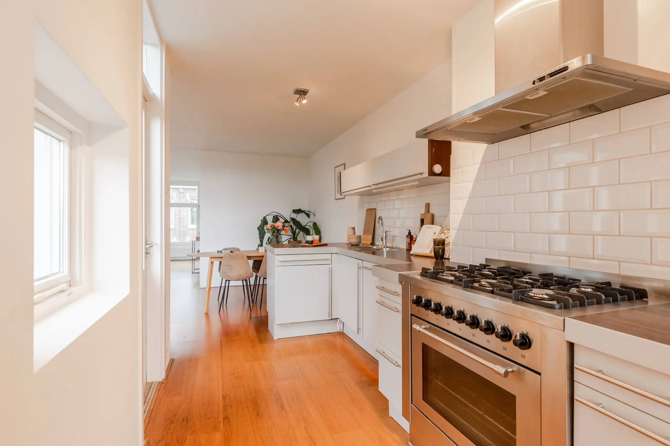 - Een gezellige eetkamer met aangrenzende open keuken, voorzien van inbouwapparatuur en voldoende werk- en opbergruimte