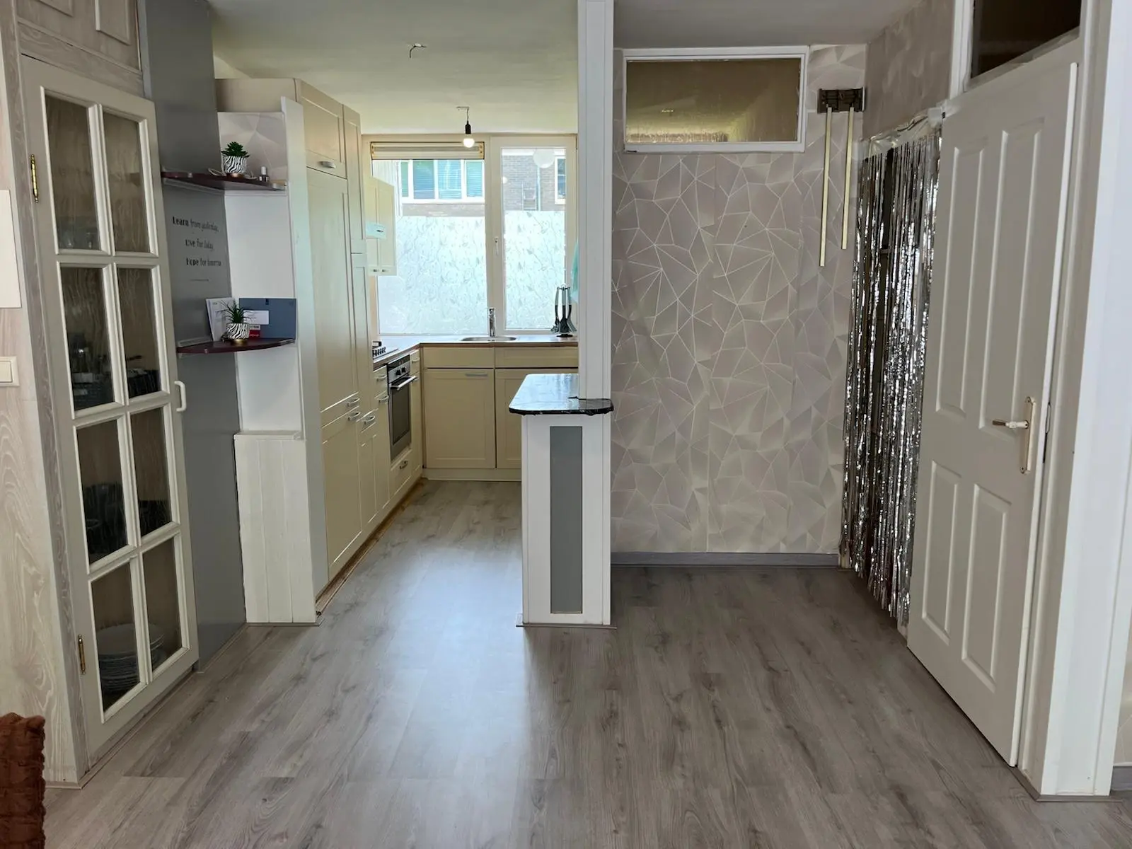 Bij binnenkomst via de ruime hal aan de voorzijde krijg je toegang tot de lichte woonkamer. De woonkamer staat in directe verbinding met de royale achtertuin, waardoor je een fijne overgang hebt tussen binnen en buiten. De half open keuken is voorzien van inbouwapparatuur. De woonkamer biedt voldoende ruimte om een gezellige eethoek te creëren. Vanuit de woonkamer stap je zo de royale achtertuin in, waar je kunt genieten van privacy en rust.
